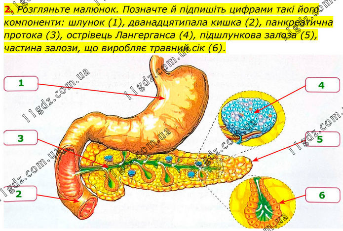 2. Розгляньте малюнок. Позначте й підпишіть цифрами такі його компоненти: шлунок (1), дванадцятипала кишка (2), панкреатична протока (3), острівець Лангерганса (4), підшлункова залоза (5), частина залози, що виробляє травний сік (6).