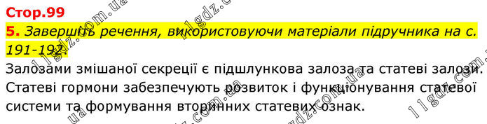 5. Завершіть речення, використовуючи матеріали підручника на с. 191-192. Залозами змішаної секреції є підшлункова залоза та статеві залози. Статеві гормони забезпечують розвиток і функціонування статевої системи та формування вторинних статевих ознак.
