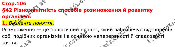 §42 Різноманітність способів розмноження й розвитку організмів 1. Визначте поняття. Розмноження — це біологічний процес, який забезпечує відтворення собі подібних організмів і є основою неперервності й спадковості життя.