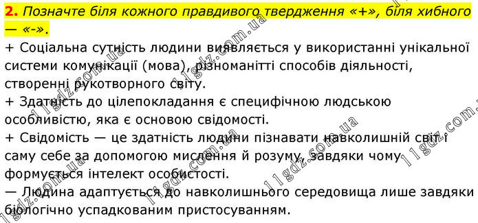 2. Позначте біля кожного правдивого твердження «+», біля хибного — «-». + Соціальна сутність людини виявляється у використанні унікальної системи комунікації (мова), різноманітті способів діяльності, створенні рукотворного світу. + Здатність до цілепокладання є специфічною людською особливістю, яка є основою свідомості. + Свідомість — це здатність людини пізнавати навколишній світ і саму себе за допомогою мислення й розуму, завдяки чому формується інтелект особистості. — Людина адаптується до навколишнього середовища лише завдяки біологічно успадкованим пристосуванням.