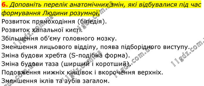 6. Доповніть перелік анатомічних змін, які відбувалися під час формування Людини розумної. Розвиток прямоходіння (біпедія). Розвиток хапальної кисті. Збільшення об’єму головного мозку. Зменшення лицьового відділу, поява підборідного виступу. Зміна будови хребта (S-подібна форма). Зміна будови таза (ширший і коротший). Подовження нижніх кінцівок і вкорочення верхніх. Зменшення іклів та зубів загалом.