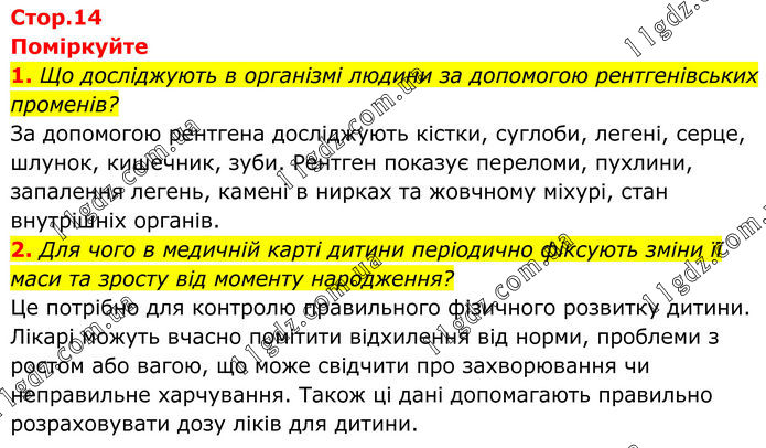 Поміркуйте 1. Що досліджують в організмі людини за допомогою рентгенівських променів? За допомогою рентгена досліджують кістки, суглоби, легені, серце, шлунок, кишечник, зуби. Рентген показує переломи, пухлини, запалення легень, камені в нирках та жовчному міхурі, стан внутрішніх органів. 2. Для чого в медичній карті дитини періодично фіксують зміни її маси та зросту від моменту народження? Це потрібно для контролю правильного фізичного розвитку дитини. Лікарі можуть вчасно помітити відхилення від норми, проблеми з ростом або вагою, що може свідчити про захворювання чи неправильне харчування. Також ці дані допомагають правильно розраховувати дозу ліків для дитини.