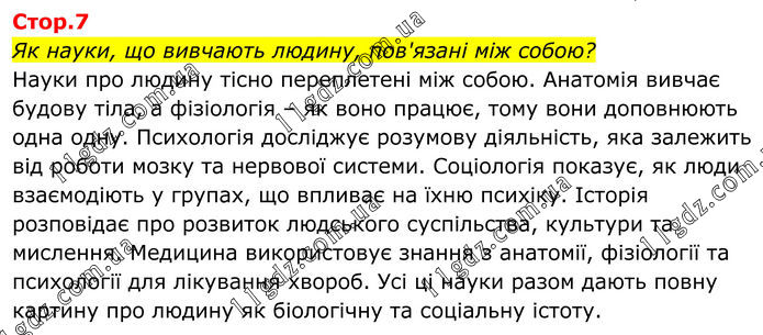 Як науки, що вивчають людину, пов'язані між собою? Науки про людину тісно переплетені між собою. Анатомія вивчає будову тіла, а фізіологія – як воно працює, тому вони доповнюють одна одну. Психологія досліджує розумову діяльність, яка залежить від роботи мозку та нервової системи. Соціологія показує, як люди взаємодіють у групах, що впливає на їхню психіку. Історія розповідає про розвиток людського суспільства, культури та мислення. Медицина використовує знання з анатомії, фізіології та психології для лікування хвороб. Усі ці науки разом дають повну картину про людину як біологічну та соціальну істоту.