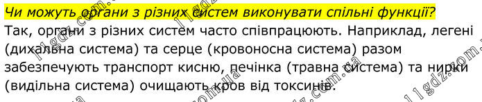 Чи можуть органи з різних систем виконувати спільні функції? Так, органи з різних систем часто співпрацюють. Наприклад, легені (дихальна система) та серце (кровоносна система) разом забезпечують транспорт кисню, печінка (травна система) та нирки (видільна система) очищають кров від токсинів.