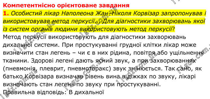 Компетентнісно орієнтоване завдання 1. Особистий лікар Наполеона Жан–Ніколя Корвізар запропонував і використовував метод перкусії... Для діагностики захворювань якої із систем органів людини використовують метод перкусії? Метод перкусії використовують для діагностики захворювань дихальної системи. При простукуванні грудної клітки лікар може визначити стан легень – чи є в них рідина, повітря або ущільнення тканини. Здорові легені дають ясний звук, а при захворюваннях (пневмонія, плеврит, пневмоторакс) звук змінюється. Так само, як батько Корвізара визначав рівень вина в діжках по звуку, лікарі визначають стан легень по звуку при простукуванні. Правильна відповідь: В дихальної