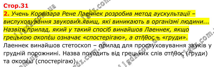 2. Учень Корвізара Рене Лаеннек розробив метод аускультації – вислуховування звукових явищ, які виникають в організмі людини... Назвіть прилад, який у такий спосіб винайшов Лаеннек, якщо грецькою σκοπέω означає «спостерігаю», а στῆθος – «груди». Лаеннек винайшов стетоскоп – прилад для прослуховування звуків у грудній порожнині. Назва походить від грецьких слів στῆθος (груди) та σκοπέω (спостерігаю).