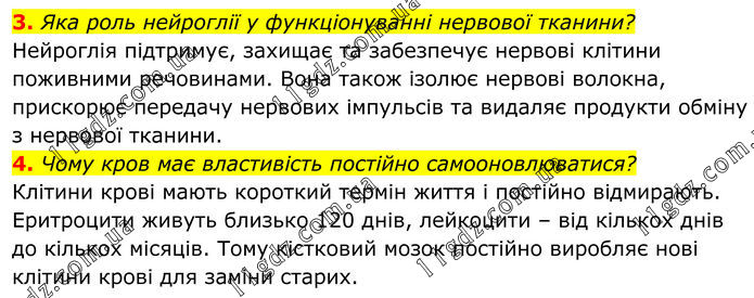 3. Яка роль нейроглії у функціонуванні нервової тканини? Нейроглія підтримує, захищає та забезпечує нервові клітини поживними речовинами. Вона також ізолює нервові волокна, прискорює передачу нервових імпульсів та видаляє продукти обміну з нервової тканини. 4. Чому кров має властивість постійно самооновлюватися? Клітини крові мають короткий термін життя і постійно відмирають. Еритроцити живуть близько 120 днів, лейкоцити – від кількох днів до кількох місяців. Тому кістковий мозок постійно виробляє нові клітини крові для заміни старих.