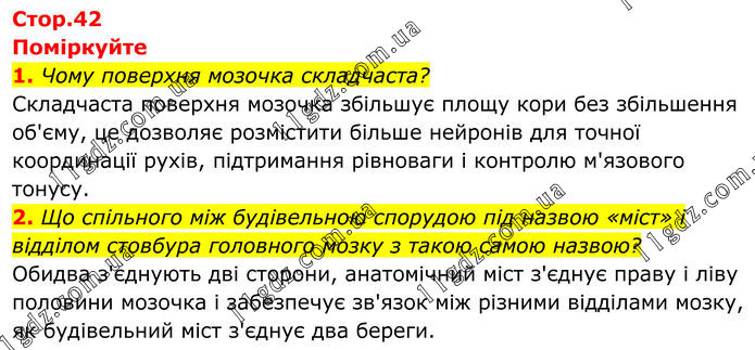 Поміркуйте 1. Чому поверхня мозочка складчаста? Складчаста поверхня мозочка збільшує площу кори без збільшення об'єму, це дозволяє розмістити більше нейронів для точної координації рухів, підтримання рівноваги і контролю м'язового тонусу. 2. Що спільного між будівельною спорудою під назвою «міст» і відділом стовбура головного мозку з такою самою назвою? Обидва з'єднують дві сторони, анатомічний міст з'єднує праву і ліву половини мозочка і забезпечує зв'язок між різними відділами мозку, як будівельний міст з'єднує два береги.
