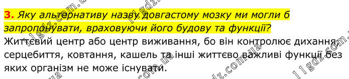 3. Яку альтернативу назву довгастому мозку ми могли б запропонувати, враховуючи його будову та функції? Життєвий центр або центр виживання, бо він контролює дихання, серцебиття, ковтання, кашель та інші життєво важливі функції без яких організм не може існувати.