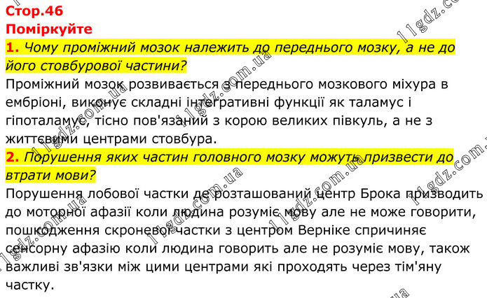 Поміркуйте 1. Чому проміжний мозок належить до переднього мозку, а не до його стовбурової частини? Проміжний мозок розвивається з переднього мозкового міхура в ембріоні, виконує складні інтегративні функції як таламус і гіпоталамус, тісно пов'язаний з корою великих півкуль, а не з життєвими центрами стовбура. 2. Порушення яких частин головного мозку можуть призвести до втрати мови? Порушення лобової частки де розташований центр Брока призводить до моторної афазії коли людина розуміє мову але не може говорити, пошкодження скроневої частки з центром Верніке спричиняє сенсорну афазію коли людина говорить але не розуміє мову, також важливі зв'язки між цими центрами які проходять через тім'яну частку.