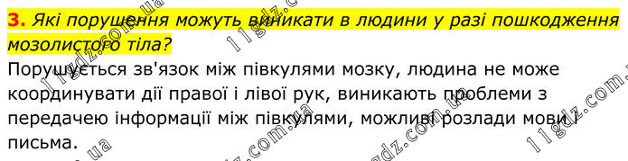 3. Які порушення можуть виникати в людини у разі пошкодження мозолистого тіла? Порушується зв'язок між півкулями мозку, людина не може координувати дії правої і лівої рук, виникають проблеми з передачею інформації між півкулями, можливі розлади мови і письма.