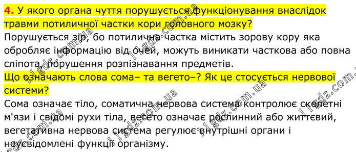 4. У якого органа чуття порушується функціонування внаслідок травми потиличної частки кори головного мозку? Порушується зір, бо потилична частка містить зорову кору яка обробляє інформацію від очей, можуть виникати часткова або повна сліпота, порушення розпізнавання предметів. Що означають слова сома– та вегето–? Як це стосується нервової системи? Сома означає тіло, соматична нервова система контролює скелетні м'язи і свідомі рухи тіла, вегето означає рослинний або життєвий, вегетативна нервова система регулює внутрішні органи і неусвідомлені функції організму.