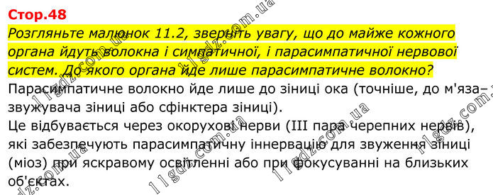 Розгляньте малюнок 11.2, зверніть увагу, що до майже кожного органа йдуть волокна і симпатичної, і парасимпатичної нервової систем. До якого органа йде лише парасимпатичне волокно? Парасимпатичне волокно йде лише до зіниці ока (точніше, до м'яза–звужувача зіниці або сфінктера зіниці). Це відбувається через окорухові нерви (III пара черепних нервів), які забезпечують парасимпатичну іннервацію для звуження зіниці (міоз) при яскравому освітленні або при фокусуванні на близьких об'єктах.