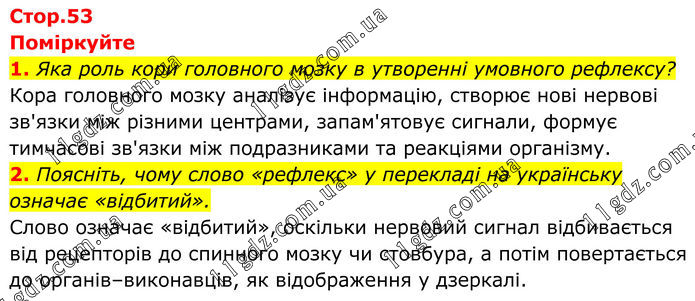 Поміркуйте 1. Яка роль кори головного мозку в утворенні умовного рефлексу? Кора головного мозку аналізує інформацію, створює нові нервові зв'язки між різними центрами, запам'ятовує сигнали, формує тимчасові зв'язки між подразниками та реакціями організму. 2. Поясніть, чому слово «рефлекс» у перекладі на українську означає «відбитий». Слово означає «відбитий», оскільки нервовий сигнал відбивається від рецепторів до спинного мозку чи стовбура, а потім повертається до органів–виконавців, як відображення у дзеркалі.