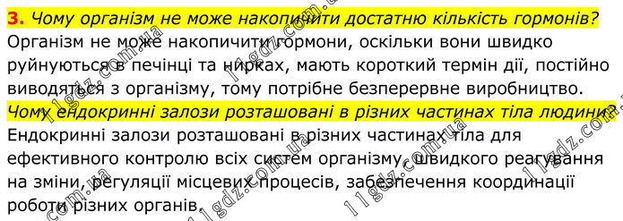 3. Чому організм не може накопичити достатню кількість гормонів? Організм не може накопичити гормони, оскільки вони швидко руйнуються в печінці та нирках, мають короткий термін дії, постійно виводяться з організму, тому потрібне безперервне виробництво. Чому ендокринні залози розташовані в різних частинах тіла людини? Ендокринні залози розташовані в різних частинах тіла для ефективного контролю всіх систем організму, швидкого реагування на зміни, регуляції місцевих процесів, забезпечення координації роботи різних органів.