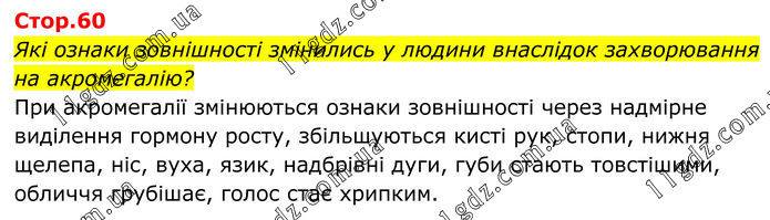 Які ознаки зовнішності змінились у людини внаслідок захворювання на акромегалію? При акромегалії змінюються ознаки зовнішності через надмірне виділення гормону росту, збільшуються кисті рук, стопи, нижня щелепа, ніс, вуха, язик, надбрівні дуги, губи стають товстішими, обличчя грубішає, голос стає хрипким.