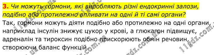 3. Чи можуть гормони, які виробляють різні ендокринні залози, подібно або протилежно впливати на одні й ті самі органи? Так, гормони можуть діяти подібно або протилежно на одні органи, наприклад інсулін знижує цукор у крові, а глюкагон підвищує, адреналін та тироксин подібно прискорюють обмін речовин, створюючи баланс функцій.