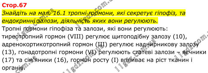 Знайдіть на мал. 16.1 тропні гормони, які секретує гіпофіз, та ендокринні залози, діяльність яких вони регулюють. Тропні гормони гіпофіза та залози, які вони регулюють: тиреотропний гормон (VIII) регулює щитоподібну залозу (10), адренокортикотропний гормон (III) регулює наднирникову залозу (13), гонадотропні гормони (VI) регулюють статеві залози – яєчники (17) та сім'яники (16), гормон росту (I) впливає на ріст тканин і органів.