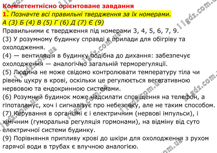 Компетентнісно орієнтоване завдання 1. Позначте всі правильні твердження за їх номерами. А (3) Б (4) В (5) Г (6) Д (7) Є (9) Правильними є твердження під номерами 3, 4, 5, 6, 7, 9. (3) У розумному будинку справді є прилади для обігріву та охолодження. (4) — вентиляція в будинку подібна до дихання: забезпечує охолодження — аналогічно загальній терморегуляції. (5) Людина не може свідомо контролювати температуру тіла чи рівень цукру в крові, оскільки це регулюється вегетативною нервовою та ендокринною системами. (6) Розумний будинок може надсилати сповіщення на телефон, а гіпоталамус, хоч і сигналізує про небезпеку, але не таким способом. (7) Керування в організмі є і електричним (нервові імпульси), і хімічним (гуморальна регуляція гормонами), на відміну від суто електричної системи будинку. (9) Порівняння припливу крові до шкіри для охолодження з рухом гарячої води в трубах є влучною аналогією.
