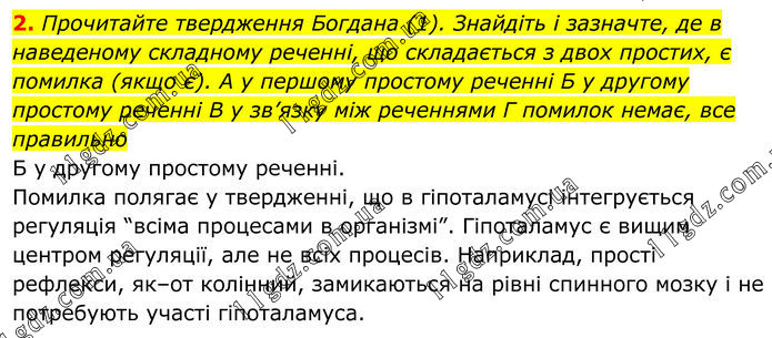 2. Прочитайте твердження Богдана (1). Знайдіть і зазначте, де в наведеному складному реченні, що складається з двох простих, є помилка (якщо є). А у першому простому реченні Б у другому простому реченні В у зв’язку між реченнями Г помилок немає, все правильно Б у другому простому реченні. Помилка полягає у твердженні, що в гіпоталамусі інтегрується регуляція “всіма процесами в організмі”. Гіпоталамус є вищим центром регуляції, але не всіх процесів. Наприклад, прості рефлекси, як–от колінний, замикаються на рівні спинного мозку і не потребують участі гіпоталамуса.