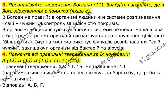 3. Проаналізуйте твердження Богдана (11). Знайдіть і зазначте, де в його міркуваннях є помилка (якщо є). В Богдан не правий: в організмі людини є й системи розпізнавання «свій – чужий», і контроль за цілісністю покривів. В організмі людини існують аналогічні системи безпеки. Наша шкіра є бар’єром, а рецептори в ній сигналізують про порушення цілісності (біль, дотик). Імунна система виконує функцію розпізнавання “свій – чужий”, захищаючи організм від бактерій та вірусів. 4. Позначте всі правильні твердження за їх номерами: А (12) Б (13) В (14) Г (15) Г (15). Правильні твердження: 12, 13, 15. Неправильне: 14 (парасимпатична система не перелаштовує на боротьбу, це робить симпатична). Відповідь: А, Б, Г.