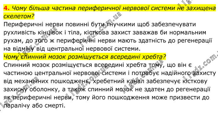 4. Чому більша частина периферичної нервової системи не захищена скелетом? Периферичні нерви повинні бути гнучкими щоб забезпечувати рухливість кінцівок і тіла, кісткова захист заважав би нормальним рухам, до того ж периферичні нерви мають здатність до регенерації на відміну від центральної нервової системи. Чому спинний мозок розміщується всередині хребта? Спинний мозок розміщується всередині хребта тому, що він є частиною центральної нервової системи і потребує надійного захисту від механічних пошкоджень, хребетний канал забезпечує кісткову захисну оболонку, а також спинний мозок не здатен до регенерації як периферичні нерви, тому його пошкодження може призвести до паралічу або смерті.
