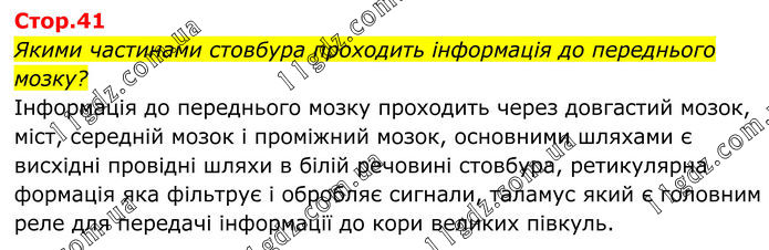 Якими частинами стовбура проходить інформація до переднього мозку? Інформація до переднього мозку проходить через довгастий мозок, міст, середній мозок і проміжний мозок, основними шляхами є висхідні провідні шляхи в білій речовині стовбура, ретикулярна формація яка фільтрує і обробляє сигнали, таламус який є головним реле для передачі інформації до кори великих півкуль.
