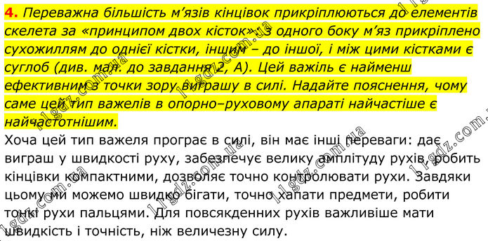 4. Переважна більшість м’язів кінцівок прикріплюються до елементів скелета за «принципом двох кісток»: з одного боку м’яз прикріплено сухожиллям до однієї кістки, іншим – до іншої, і між цими кістками є суглоб (див. мал. до завдання 2, А). Цей важіль є найменш ефективним з точки зору виграшу в силі. Надайте пояснення, чому саме цей тип важелів в опорно–руховому апараті найчастіше є найчастотнішим. Хоча цей тип важеля програє в силі, він має інші переваги: дає виграш у швидкості руху, забезпечує велику амплітуду рухів, робить кінцівки компактними, дозволяє точно контролювати рухи. Завдяки цьому ми можемо швидко бігати, точно хапати предмети, робити тонкі рухи пальцями. Для повсякденних рухів важливіше мати швидкість і точність, ніж величезну силу.