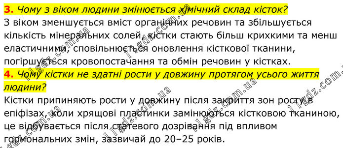3. Чому з віком людини змінюється хімічний склад кісток? З віком зменшується вміст органічних речовин та збільшується кількість мінеральних солей, кістки стають більш крихкими та менш еластичними, сповільнюється оновлення кісткової тканини, погіршується кровопостачання та обмін речовин у кістках. 4. Чому кістки не здатні рости у довжину протягом усього життя людини? Кістки припиняють рости у довжину після закриття зон росту в епіфізах, коли хрящові пластинки замінюються кістковою тканиною, це відбувається після статевого дозрівання під впливом гормональних змін, зазвичай до 20–25 років.