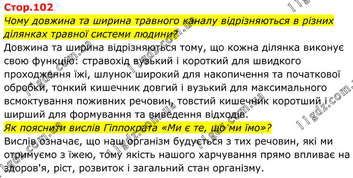 Чому довжина та ширина травного каналу відрізняються в різних ділянках травної системи людини? Довжина та ширина відрізняються тому, що кожна ділянка виконує свою функцію: стравохід вузький і короткий для швидкого проходження їжі, шлунок широкий для накопичення та початкової обробки, тонкий кишечник довгий і вузький для максимального всмоктування поживних речовин, товстий кишечник коротший і ширший для формування та виведення відходів. Як пояснити вислів Гіппократа «Ми є те, що ми їмо»? Вислів означає, що наш організм будується з тих речовин, які ми отримуємо з їжею, тому якість нашого харчування прямо впливає на здоров'я, ріст, розвиток і загальний стан організму.