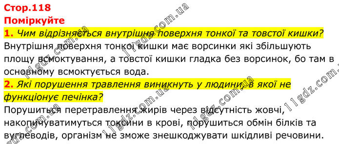 Поміркуйте 1. Чим відрізняється внутрішня поверхня тонкої та товстої кишки? Внутрішня поверхня тонкої кишки має ворсинки які збільшують площу всмоктування, а товстої кишки гладка без ворсинок, бо там в основному всмоктується вода. 2. Які порушення травлення виникнуть у людини, в якої не функціонує печінка? Порушиться перетравлення жирів через відсутність жовчі, накопичуватимуться токсини в крові, порушиться обмін білків та вуглеводів, організм не зможе знешкоджувати шкідливі речовини.
