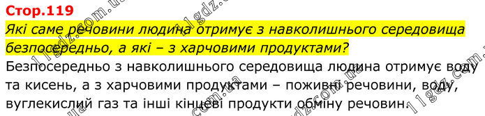 Які саме речовини людина отримує з навколишнього середовища безпосередньо, а які – з харчовими продуктами? Безпосередньо з навколишнього середовища людина отримує воду та кисень, а з харчовими продуктами – поживні речовини, воду, вуглекислий газ та інші кінцеві продукти обміну речовин.