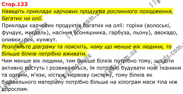 Наведіть приклади харчових продуктів рослинного походження, багатих на олії. Приклади харчових продуктів багатих на олії: горіхи (волоські, фундук, мигдаль), насіння (соняшника, гарбуза, льону), авокадо, оливки, соя, кунжут. Розгляньте діаграму та поясніть, чому що менше вік людини, то більше білків потрібно вживати. Чим менше вік людини, тим більше білків потрібно тому, що діти активно ростуть і розвиваються, їм потрібно будувати нові тканини та органи, м'язи, кістки, нервову систему, тому білків як будівельного матеріалу потрібно більше на кілограм маси тіла ніж дорослим.