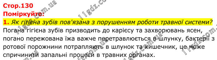 Поміркуйте: 1. Як гігієна зубів пов'язана з порушенням роботи травної системи? Погана гігієна зубів призводить до карієсу та захворювань ясен, погано пережована їжа важче перетравлюється в шлунку, бактерії з ротової порожнини потрапляють в шлунок та кишечник, це може спричинити запальні процеси в травних органах.