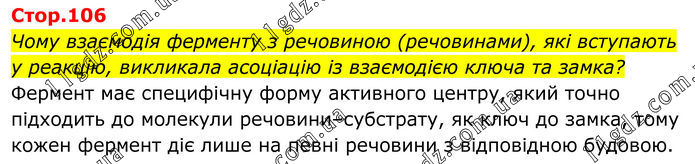 Чому взаємодія ферменту з речовиною (речовинами), які вступають у реакцію, викликала асоціацію із взаємодією ключа та замка? Фермент має специфічну форму активного центру, який точно підходить до молекули речовини–субстрату, як ключ до замка, тому кожен фермент діє лише на певні речовини з відповідною будовою.