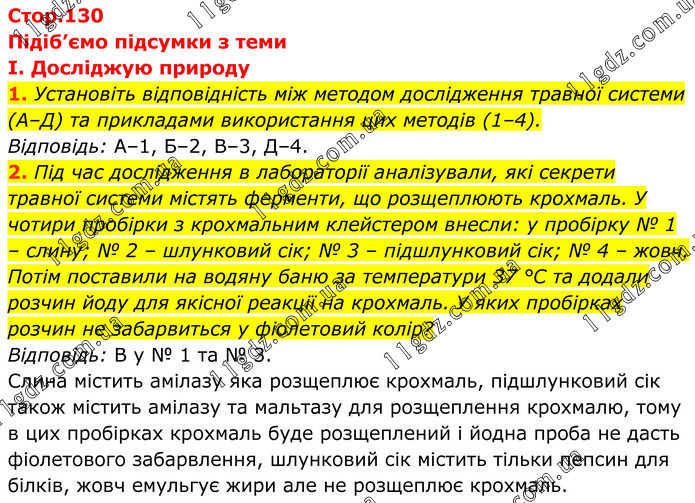 Підіб’ємо підсумки з теми І. Досліджую природу 1. Установіть відповідність між методом дослідження травної системи (А–Д) та прикладами використання цих методів (1–4). Відповідь: А–1, Б–2, В–3, Д–4. 2. Під час дослідження в лабораторії аналізували, які секрети травної системи містять ферменти, що розщеплюють крохмаль. У чотири пробірки з крохмальним клейстером внесли: у пробірку № 1 – слину; № 2 – шлунковий сік; № 3 – підшлунковий сік; № 4 – жовч. Потім поставили на водяну баню за температури 37 °С та додали розчин йоду для якісної реакції на крохмаль. У яких пробірках розчин не забарвиться у фіолетовий колір? Відповідь: В у № 1 та № 3. Слина містить амілазу яка розщеплює крохмаль, підшлунковий сік також містить амілазу та мальтазу для розщеплення крохмалю, тому в цих пробірках крохмаль буде розщеплений і йодна проба не дасть фіолетового забарвлення, шлунковий сік містить тільки пепсин для білків, жовч емульгує жири але не розщеплює крохмаль.