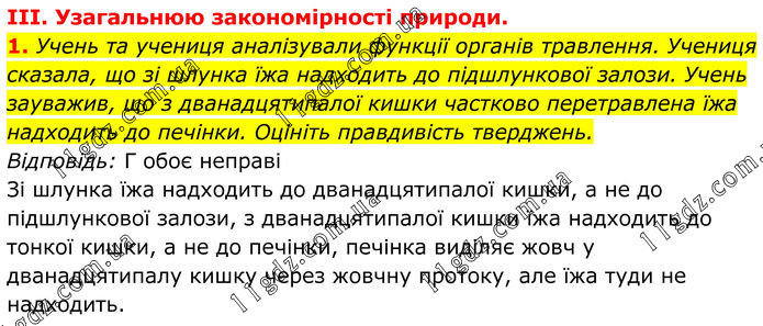 ІІІ. Узагальнюю закономірності природи. 1. Учень та учениця аналізували функції органів травлення. Учениця сказала, що зі шлунка їжа надходить до підшлункової залози. Учень заува¬жив, що з дванадцятипалої кишки частково перетравлена їжа надходить до печінки. Оцініть правдивість тверджень. Відповідь: Г обоє неправі Зі шлунка їжа надходить до дванадцятипалої кишки, а не до підшлункової залози, з дванадцятипалої кишки їжа надходить до тонкої кишки, а не до печінки, печінка виділяє жовч у дванадцятипалу кишку через жовчну протоку, але їжа туди не надходить.