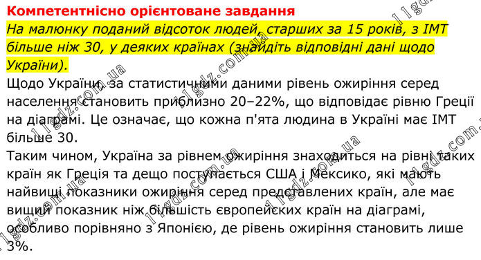 Компетентнісно орієнтоване завдання На малюнку поданий відсоток людей, старших за 15 років, з ІМТ більше ніж 30, у деяких країнах (знайдіть відповідні дані щодо України). Щодо України, за статистичними даними рівень ожиріння серед населення становить приблизно 20–22%, що відповідає рівню Греції на діаграмі. Це означає, що кожна п'ята людина в Україні має ІМТ більше 30. Таким чином, Україна за рівнем ожиріння знаходиться на рівні таких країн як Греція та дещо поступається США і Мексико, які мають найвищі показники ожиріння серед представлених країн, але має вищий показник ніж більшість європейских країн на діаграмі, особливо порівняно з Японією, де рівень ожиріння становить лише 3%.