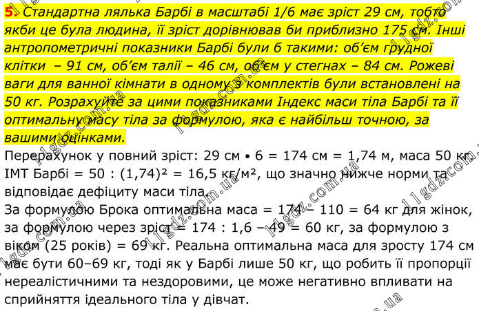 5. Стандартна лялька Барбі в масштабі 1/6 має зріст 29 см, тобто якби це була людина, її зріст дорівнював би приблизно 175 см. Інші антропометричні показники Барбі були б такими: об’єм грудної клітки – 91 см, об’єм талії – 46 см, об’єм у стегнах – 84 см. Рожеві ваги для ванної кімнати в одному з комплектів були встановлені на 50 кг. Розрахуйте за цими показниками Індекс маси тіла Барбі та її оптимальну масу тіла за формулою, яка є найбільш точною, за вашими оцінками. Перерахунок у повний зріст: 29 см • 6 = 174 см = 1,74 м, маса 50 кг. ІМТ Барбі = 50 : (1,74)² = 16,5 кг/м², що значно нижче норми та відповідає дефіциту маси тіла. За формулою Брока оптимальна маса = 174 – 110 = 64 кг для жінок, за формулою через зріст = 174 : 1,6 – 49 = 60 кг, за формулою з віком (25 років) = 69 кг. Реальна оптимальна маса для зросту 174 см має бути 60–69 кг, тоді як у Барбі лише 50 кг, що робить її пропорції нереалістичними та нездоровими, це може негативно впливати на сприйняття ідеального тіла у дівчат.