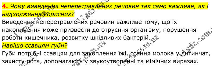 4. Чому виведення неперетравлених речовин так само важливе, як і надходження корисних? Виведення неперетравлених речовин важливе тому, що їх накопичення може призвести до отруєння організму, порушення роботи кишечника, розвитку шкідливих бактерій. Навіщо ссавцям губи? Губи потрібні ссавцям для захоплення їжі, ссання молока у дитинчат, захисту рота, допомагають у звукоутворенні та мімічних виразах.