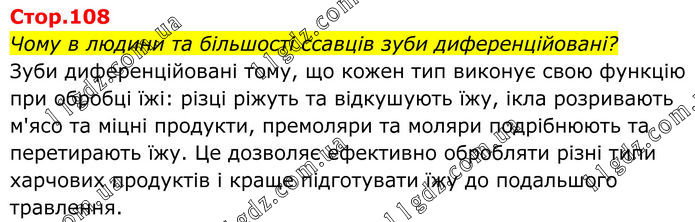 Чому в людини та більшості ссавців зуби диференційовані? Зуби диференційовані тому, що кожен тип виконує свою функцію при обробці їжі: різці ріжуть та відкушують їжу, ікла розривають м'ясо та міцні продукти, премоляри та моляри подрібнюють та перетирають їжу. Це дозволяє ефективно обробляти різні типи харчових продуктів і краще підготувати їжу до подальшого травлення.