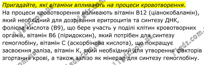 Пригадайте, які вітаміни впливають на процеси кровотворення. На процеси кровотворення впливають вітамін В12 (ціанокобаламін), який необхідний для дозрівання еритроцитів та синтезу ДНК, фолієва кислота (В9), що бере участь у поділі клітин кровотворних органів, вітамін В6 (піридоксин), який потрібен для синтезу гемоглобіну, вітамін С (аскорбінова кислота), що покращує засвоєння заліза, вітамін К, який необхідний для утворення факторів згортання крові, а також залізо як мінерал для синтезу гемоглобіну.