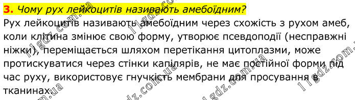 3. Чому рух лейкоцитів називають амебоїдним? Рух лейкоцитів називають амебоїдним через схожість з рухом амеб, коли клітина змінює свою форму, утворює псевдоподії (несправжні ніжки), переміщається шляхом перетікання цитоплазми, може протискуватися через стінки капілярів, не має постійної форми під час руху, використовує гнучкість мембрани для просування в тканинах.