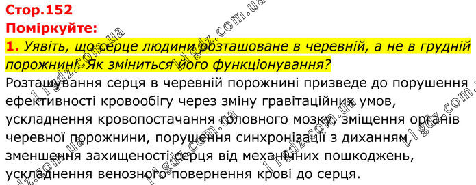 Поміркуйте: 1. Уявіть, що серце людини розташоване в черевній, а не в грудній порожнині. Як зміниться його функціонування? Розташування серця в черевній порожнині призведе до порушення ефективності кровообігу через зміну гравітаційних умов, ускладнення кровопостачання головного мозку, зміщення органів черевної порожнини, порушення синхронізації з диханням, зменшення захищеності серця від механічних пошкоджень, ускладнення венозного повернення крові до серця.