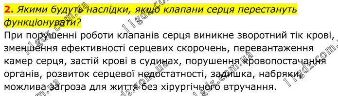 2. Якими будуть наслідки, якщо клапани серця перестануть функціонувати? При порушенні роботи клапанів серця виникне зворотний тік крові, зменшення ефективності серцевих скорочень, перевантаження камер серця, застій крові в судинах, порушення кровопостачання органів, розвиток серцевої недостатності, задишка, набряки, можлива загроза для життя без хірургічного втручання.