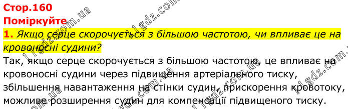 Поміркуйте 1. Якщо серце скорочується з більшою частотою, чи впливає це на кровоносні судини? Так, якщо серце скорочується з більшою частотою, це впливає на кровоносні судини через підвищення артеріального тиску, збільшення навантаження на стінки судин, прискорення кровотоку, можливе розширення судин для компенсації підвищеного тиску.