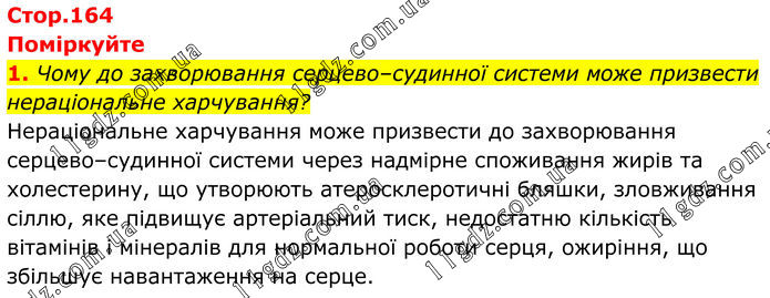 Поміркуйте 1. Чому до захворювання серцево–судинної системи може призвести нераціональне харчування? Нераціональне харчування може призвести до захворювання серцево–судинної системи через надмірне споживання жирів та холестерину, що утворюють атеросклеротичні бляшки, зловживання сіллю, яке підвищує артеріальний тиск, недостатню кількість вітамінів і мінералів для нормальної роботи серця, ожиріння, що збільшує навантаження на серце.