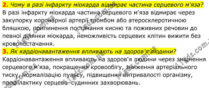 2. Чому в разі інфаркту міокарда відмирає частина серцевого м'яза? В разі інфаркту міокарда частина серцевого м'яза відмирає через закупорку коронарної артерії тромбом або атеросклеротичною бляшкою, припинення постачання кисню та поживних речовин до певної ділянки міокарда, неможливість серцевих клітин вижити без кровопостачання. 3. Як кардіонавантаження впливають на здоров'я людини? Кардіонавантаження впливають на здоров'я людини через зміцнення серцевого м'яза, покращення кровообігу, зниження артеріального тиску, нормалізацію пульсу, підвищення витривалості організму, профілактику серцево–судинних захворювань.