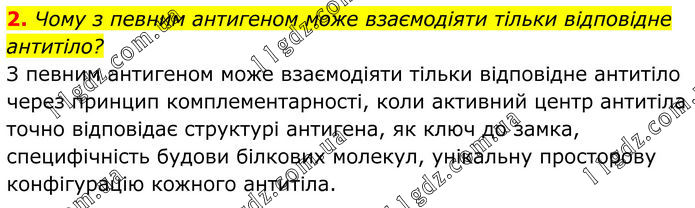 2. Чому з певним антигеном може взаємодіяти тільки відповідне антитіло? З певним антигеном може взаємодіяти тільки відповідне антитіло через принцип комплементарності, коли активний центр антитіла точно відповідає структурі антигена, як ключ до замка, специфічність будови білкових молекул, унікальну просторову конфігурацію кожного антитіла.