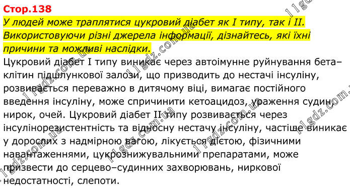 У людей може траплятися цукровий діабет як І типу, так і ІІ. Використовуючи різні джерела інформації, дізнайтесь, які їхні причини та можливі наслідки. Цукровий діабет І типу виникає через автоімунне руйнування бета–клітин підшлункової залози, що призводить до нестачі інсуліну, розвивається переважно в дитячому віці, вимагає постійного введення інсуліну, може спричинити кетоацидоз, ураження судин, нирок, очей. Цукровий діабет ІІ типу розвивається через інсулінорезистентність та відносну нестачу інсуліну, частіше виникає у дорослих з надмірною вагою, лікується дієтою, фізичними навантаженнями, цукрознижувальними препаратами, може призвести до серцево–судинних захворювань, ниркової недостатності, слепоти.